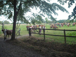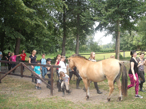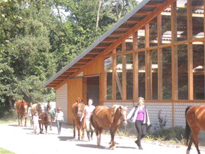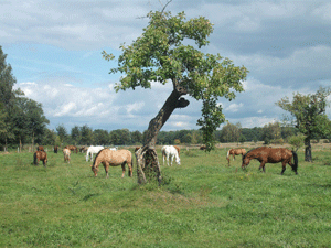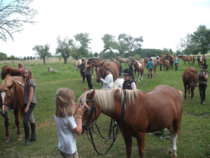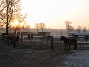 | Pferde holen | Die Pferde werden auf der Weide aufgetrenst... | ... zum Reitplatz geführt... | ... um die Halle herum... |
