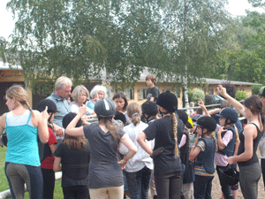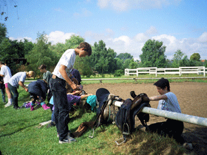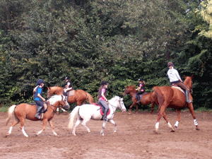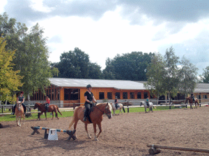 | und auf dem Reitplatz geputzt und gesattelt | Verteilen der Reitpferde | Dressurstunde auf dem großen Dressurplatz | |
